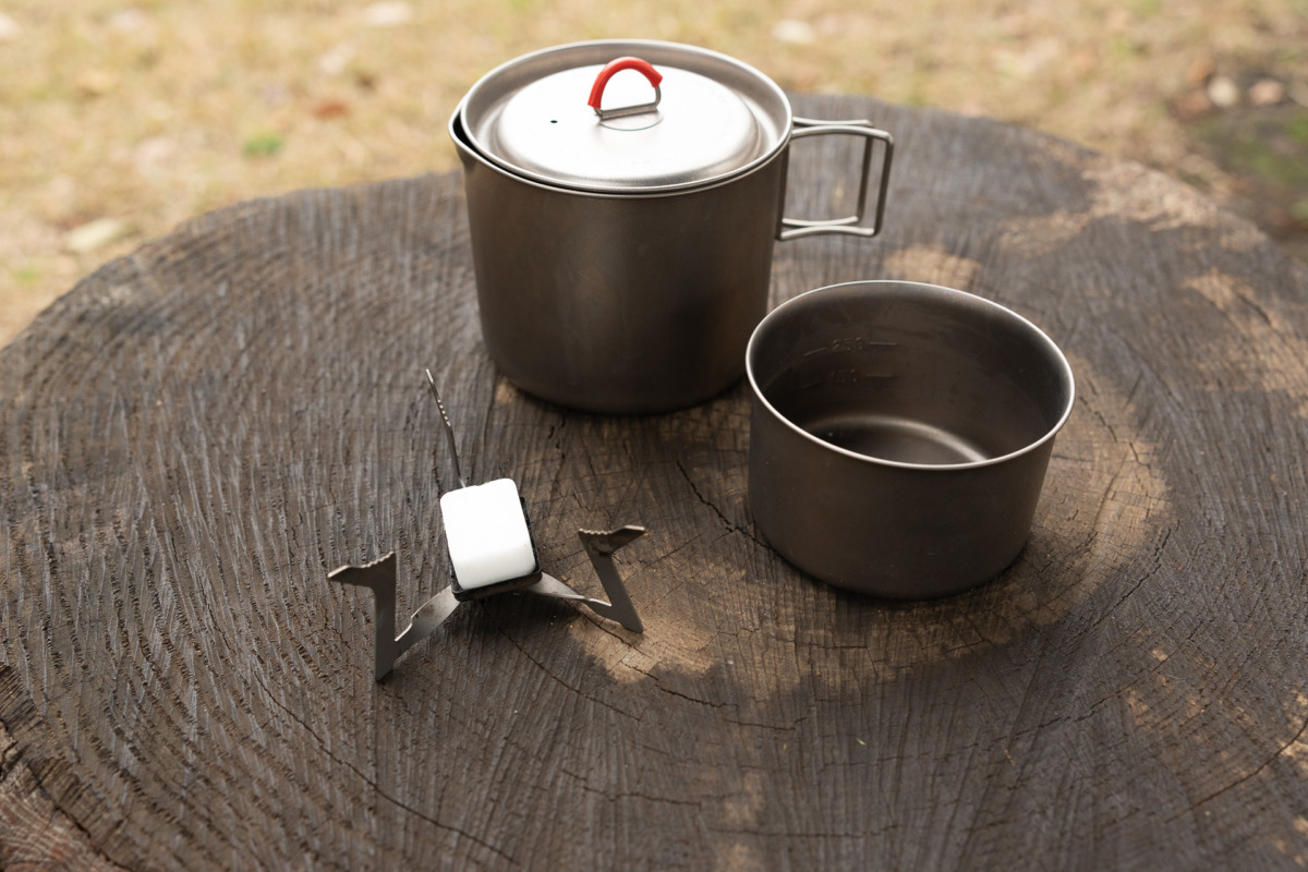 エバニューチタニウムディープポット900ml99g、チタン250カップ24g、エスビットチタニュームストーブ15g、固形燃料1個14g(12分燃焼)×6個、まな板98g。