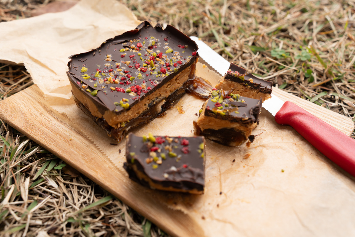容器に種をとったデーツを敷き、ピーナッツバターを重ね、最後にチョコレートをかけるだけで、できあがり。