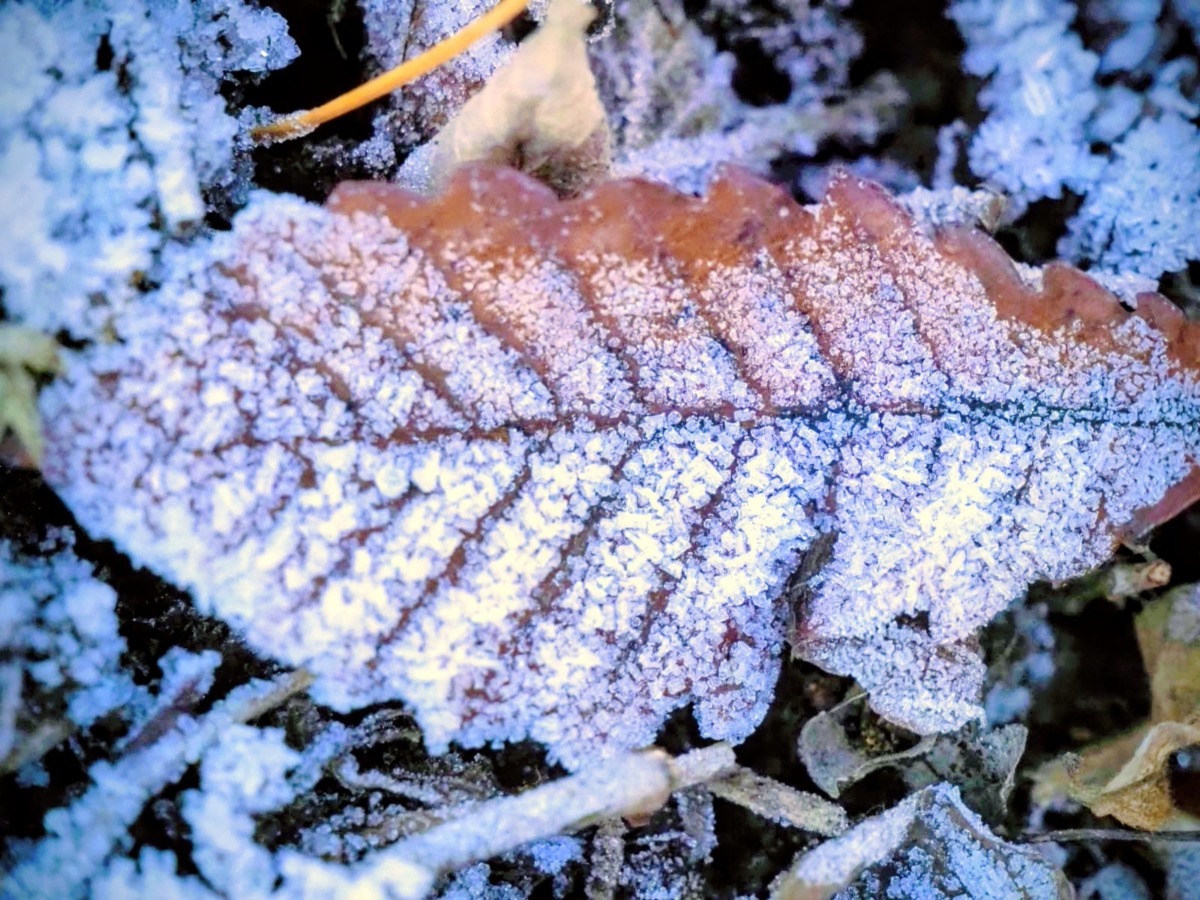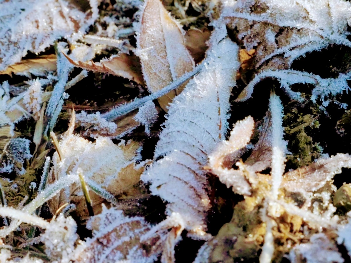 河口湖駅から緑色の循環バスに乗って西湖方面へ。バスを降りた瞬間、足元には葉っぱを縁取るように真っ白な霜が広がっていました。思わずふたりで立ち止まり、登山口に向かう前からカメラを取り出します。冷えた地面にきらきらと輝く小さな冬景色に、早くも気持ちがほぐれていきます。