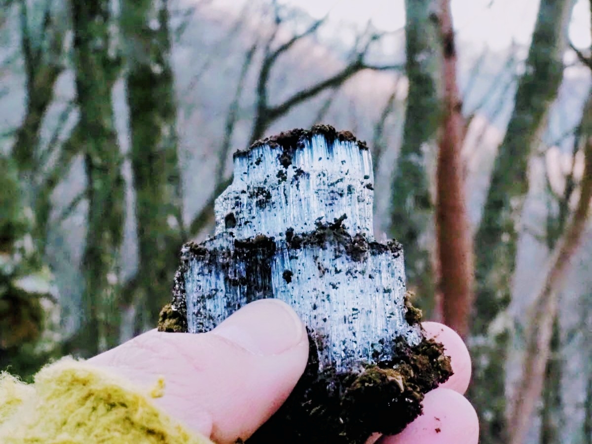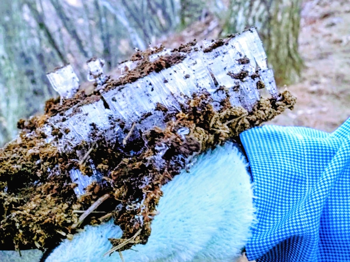 三湖台へ向かう道では、さらに立派な霜柱が登山道一面に。手袋の手でそっと持ってみたり、しゃがんで写真を撮ったりと、なかなか前に進めません。手袋の手に掴んで、載せて、見せ合って。なんだか子どものころを思い出します!