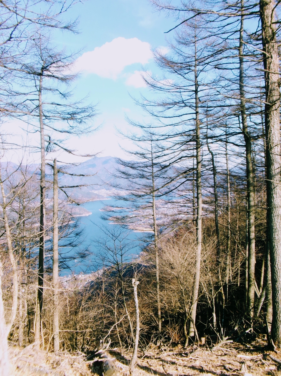 下山は河口湖を一望しながら。このあとも段和山、羽根子山とピークは続きます。途中、西陽に輝くグリーンに吸い寄せられ、見ればそれはヒノキの林。冬枯れの中でそこだけが鮮やかに光り、思わず足を止めて友と撮影タイム。