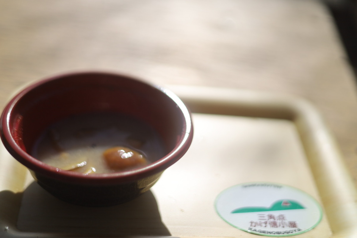 小屋の前にはちょうどそのころの「かげ信小屋」の古い写真も飾られており、おいしいなめこ汁(350円)をいただきながら、父の若き日に思いを馳せるひとときとなりました。