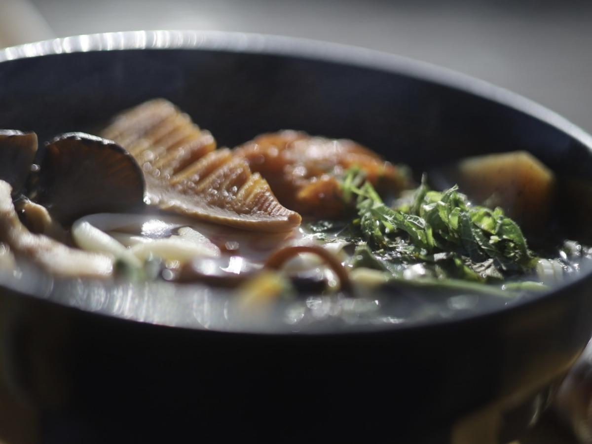陣馬山に戻ってからは、昼食に「陣馬うどん(800円)」をいただきました!山菜たっぷりで体も温まり、大満足。
