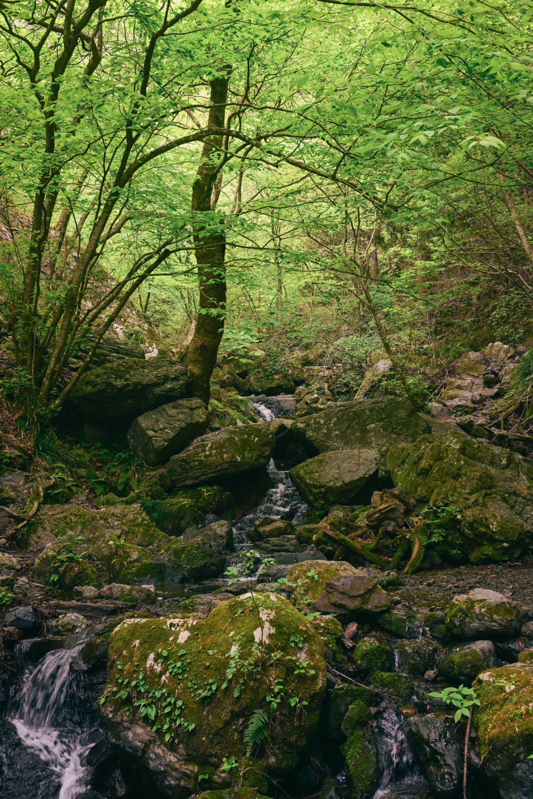 岩を越え、流れに沿って進む時間は“ちいさな沢登り”のよう。いつのまにか、沢と新緑の世界に溶け込んでいました。関東の山とは思えないほど沢の世界に入り込むことができるのも、この山の魅力だと思っています。