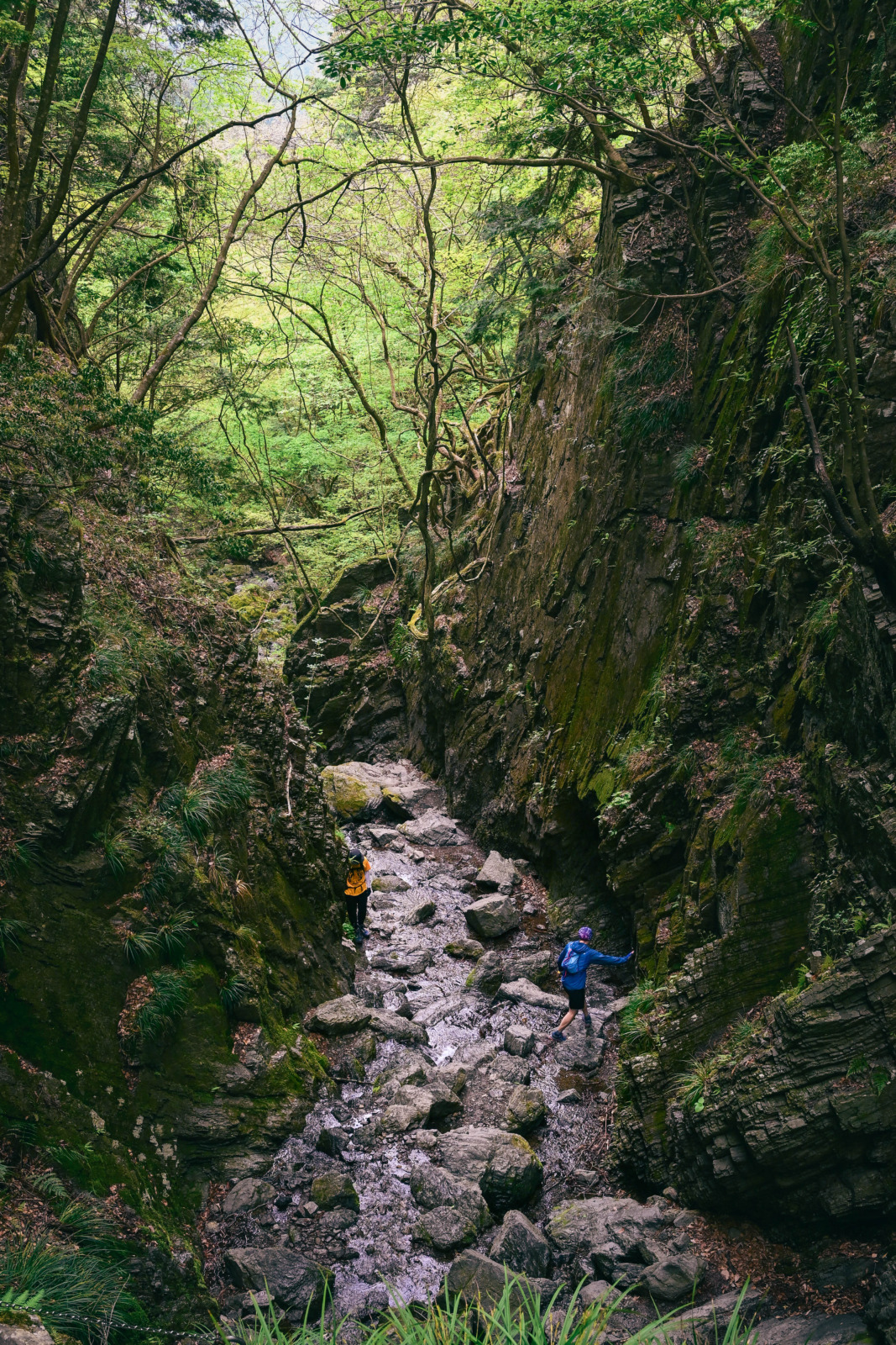 沢を渡りながら進んでいくと、やがて両岸を切り立った岩壁に囲まれたゴルジュ帯へ。まるで岩の回廊のようで、足元を流れる水音がいっそう深く響きます。