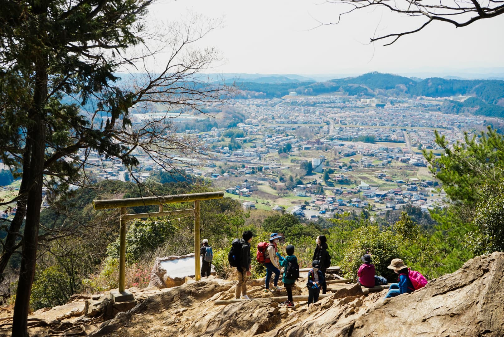 物見山などのピークを越え、いよいよ日和田山へ。山頂からの眺めも抜群ですが、とっておきの休憩スポットはその少し先、「金刀比羅神社」の二の鳥居です。振り返れば、遠くのスカイツリーまで見渡せる大パノラマ。足元には桜色に染まった「巾着田」が広がり、春の陽気に包まれていると、遠くから届く遠足の子どもたちの声に、ついうとうとしてしまいそう。