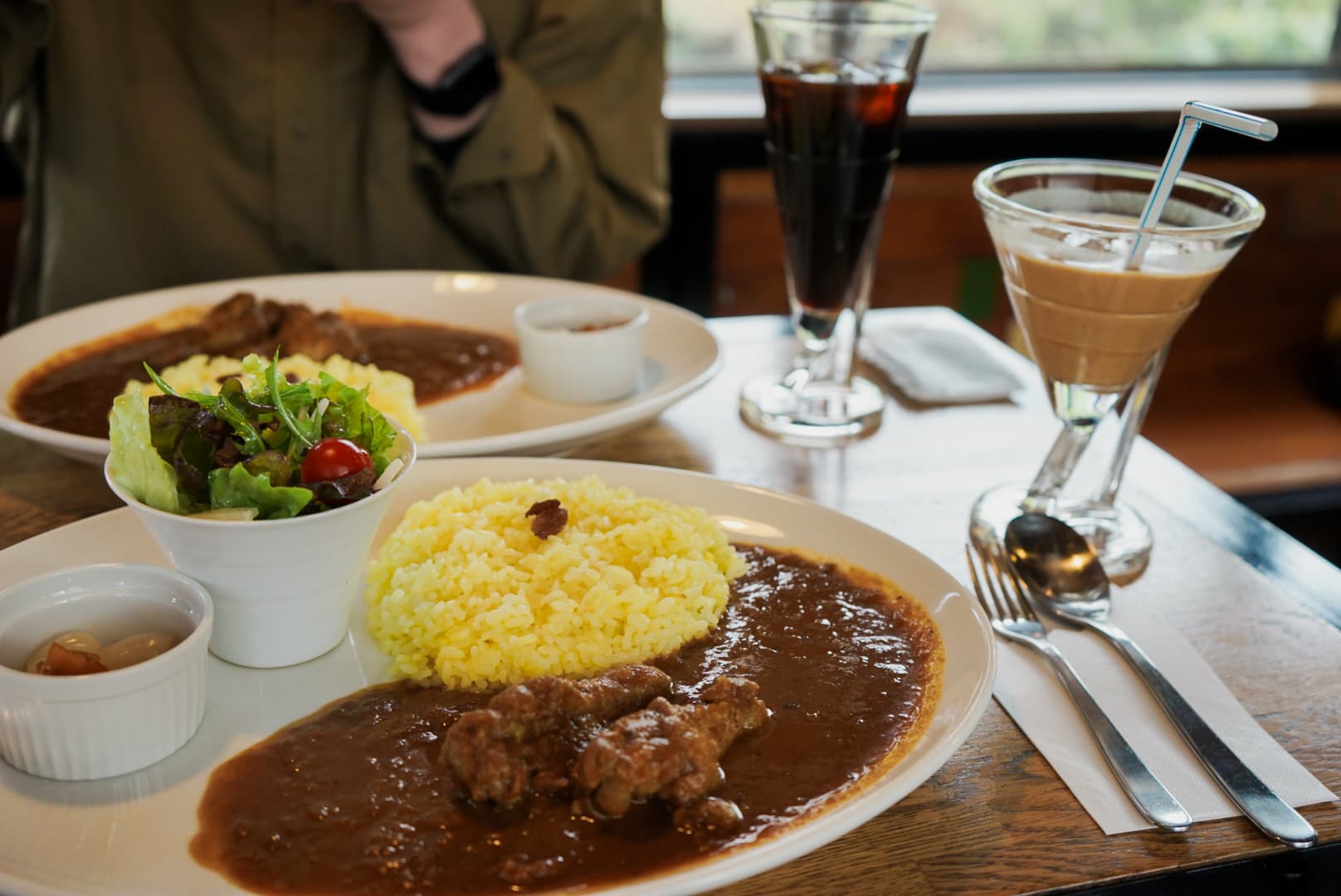 名残惜しさを感じつつ、岩場の「男坂」か、緩やかな「女坂」を選んで下山。山を降りておなかが空いたら、ぜひ立ち寄ってほしいのが「ムササビ亭」です。レトロなバスがそのまま店舗になった隠れ家のようなカレー屋さんで、絶品のチキンカレーが味わえます。