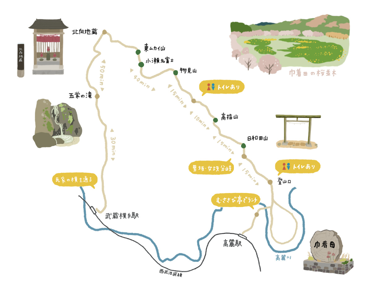 武蔵横手駅→五常の滝→北向地蔵→物見山→日和田山(金刀比羅神社)→(ムササビ亭)→巾着田→高麗駅(約3時間)