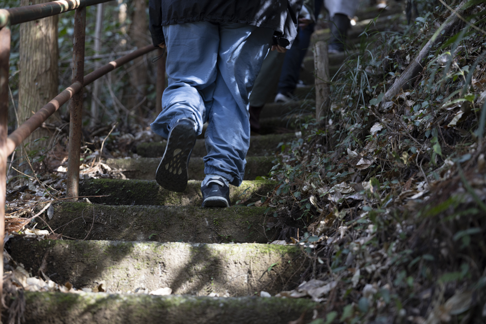 ▲道中は、切り立った崖の横を通り、急な階段を下る場面もある。足元に気を配りながら歩きたい道のりなので、訪れる際はグリップのよいシューズがおすすめ。この土地の自然の迫力を感じる時間に。