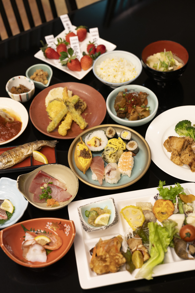 夕食は、阿蘇の郷土料理や地元食材を生かしたビュッフェ。揚げたての天ぷらや握りたての鮨のほか、囲炉裏で焼く山女魚の塩焼き、だご汁、辛子蓮根など、地元の味に出会える。その土地にいる実感を、食の時間からも味わえるのがうれしい。