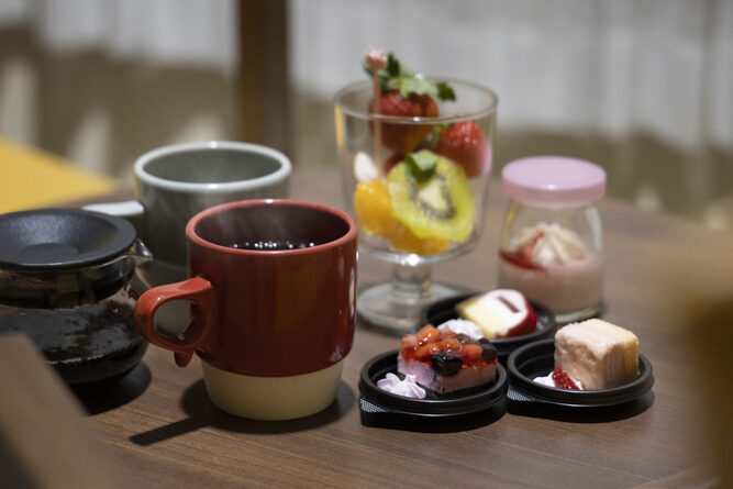 ▲熊本のフルーツも楽しめる。また、スイーツの種類も豊富で、部屋へ持ち帰り、山の話をしながらゆっくり味わえる。常連客にも人気のサービス