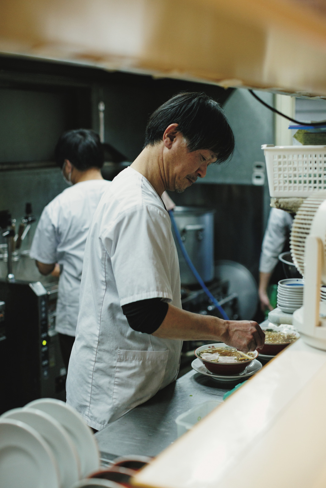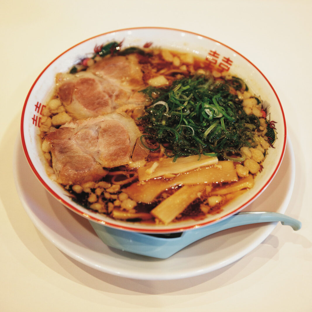 チャーシュー、メンマ、ネギをのせたシンプルな一杯 。スープは注文ごとに手鍋で温め、最後まで熱々のまま味わえる。