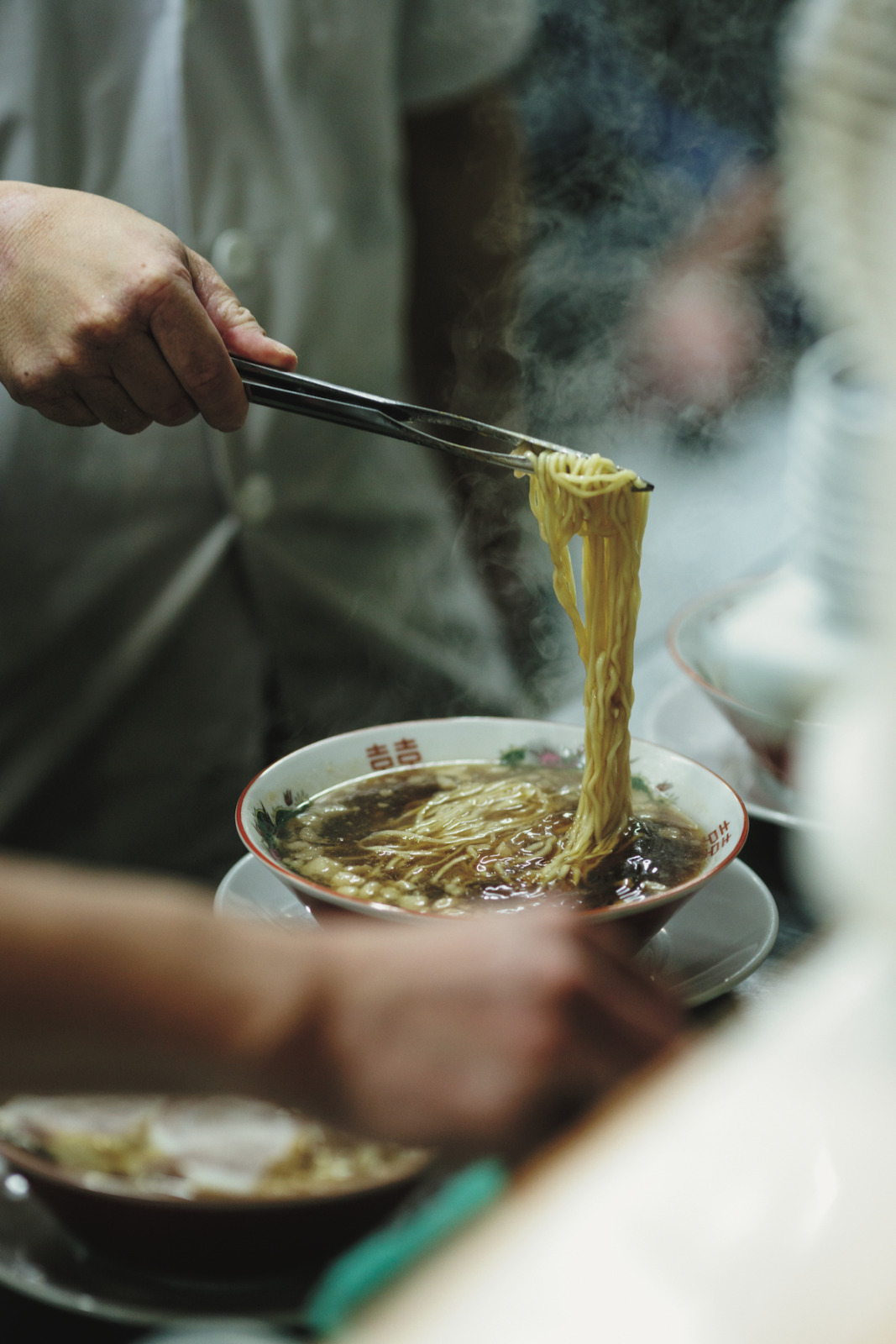 「びっくりするほど熱く、喉が渇かない」を掲げる尾道ラーメンの名店「丸ぼし」。小鯛をベースに小魚でとった和ダシと瀬戸内の「マルキン醤油」を合わせ、背脂ミンチが溶け込む熱々スープ 。平打ち麺をすすれば、山の疲れも一気に吹き飛ぶ 。
