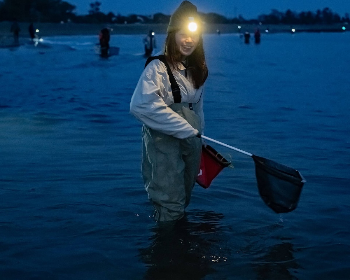 キャンプ場で少し仮眠をとり、夜中12時に目当ての海岸に到着。駐車場はほぼ満車だ。慌ててウェーダーに着替え、海へと急ぐ。ヘッドランプの光がポツポツと海に反射している。タモを持った人たちが、海を見つめながら静かに歩き回っていた。
