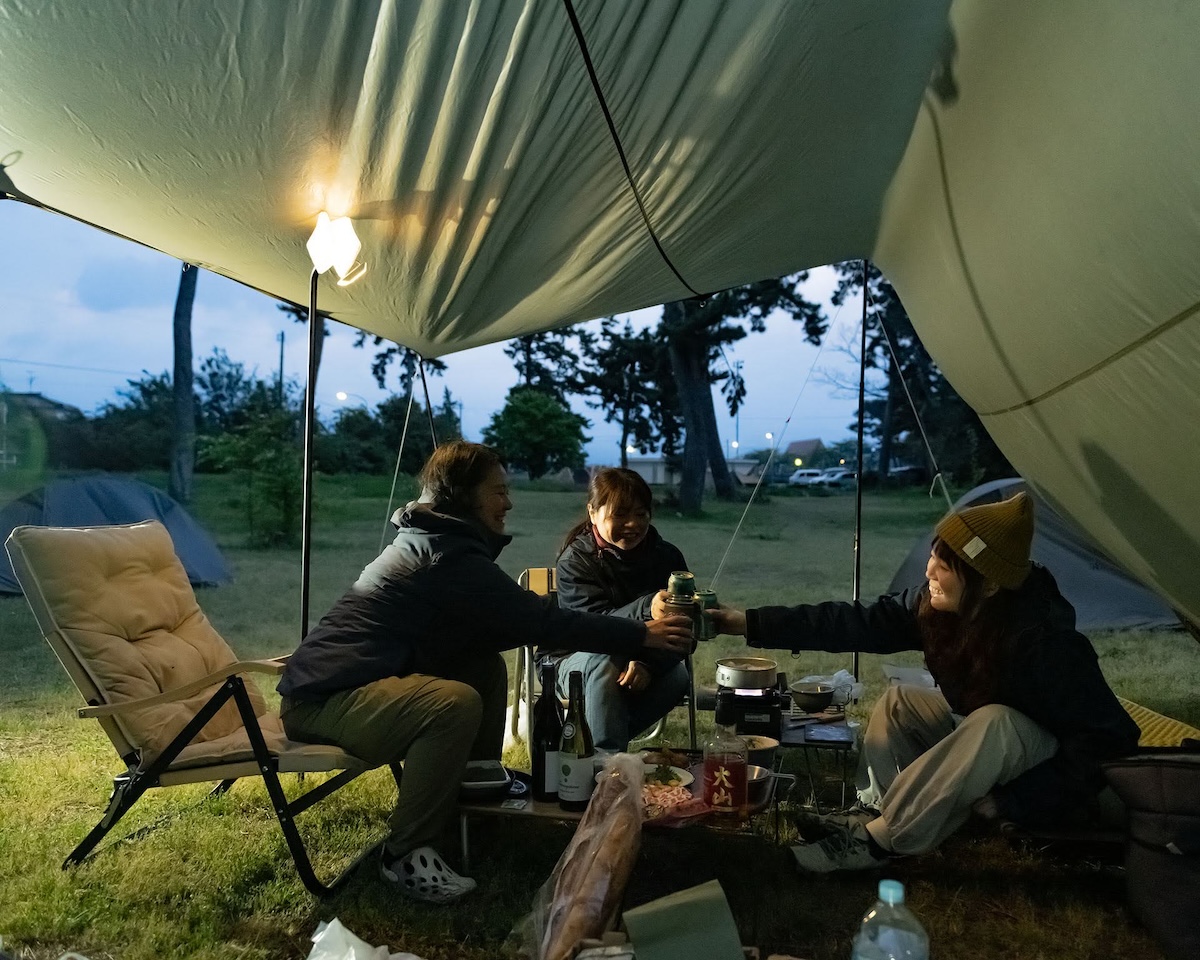 ▲春でもまだ寒い富山。キャンプの装備や服装は万全に。冷える前にダウンを着込んで宴会がスタート。たらふく買った地元の日本酒やワインをお供にホタルイカすくいのリベンジ話で盛り上がる
