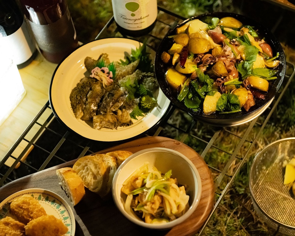 ▲ぷりぷりのホタルイカをベースに豪華なキャンプディナー。ささっと手作りしたものを中心に、近くの鮮魚店で購入した気になるお惣菜「とろろ昆布でしめた白身魚」がこれまたうまい!