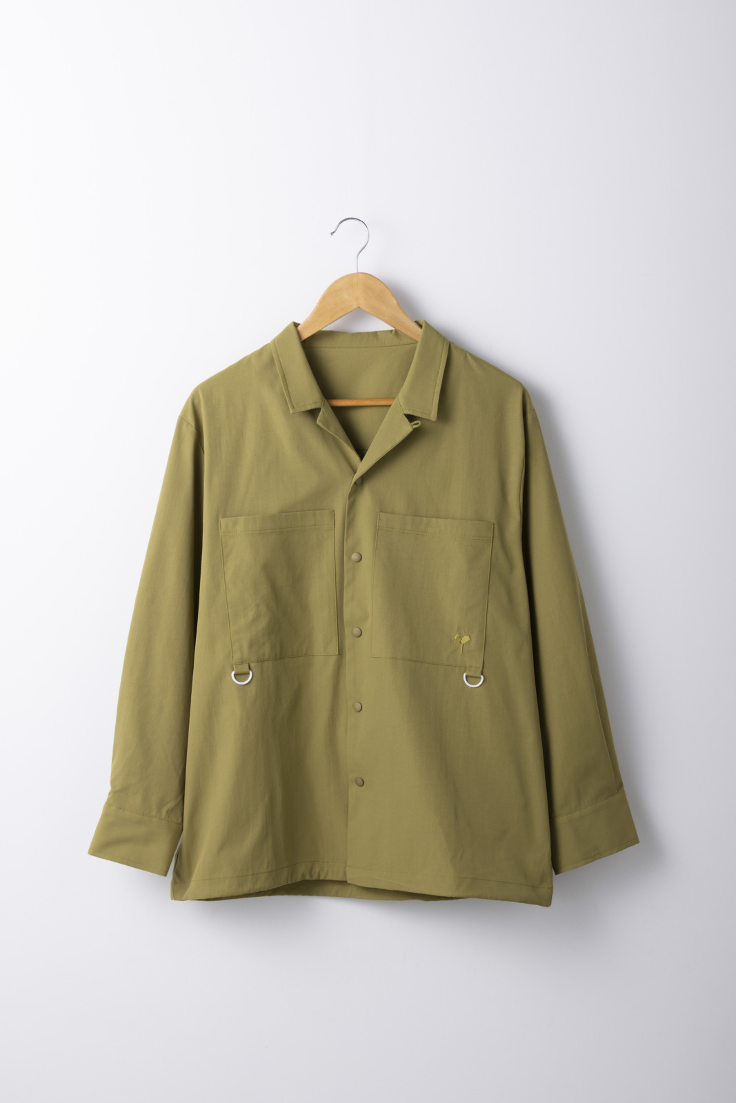 スタイリスト東 美穂さんと、かわり芽のコラボアイテム。山歩きはもちろん、キャンプや旅など、さまざまなアウトドアフィールドで気軽に着てもらいたいと、オーバーサイズのデザインに。シャツとしても、アウターとしても取り入れることができる、万能な一枚。胸に大きく配したポケットには、リップクリームや行動食などもイン。裾にはドローコードを備え、コーディネートに合わせて絞り方を変えることができる。