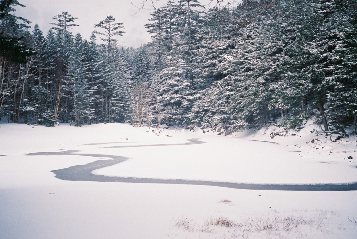 雪融けの始まる4月初旬、雪に覆われたみどり池。年によってはハート型になることもあるそう。ふもとではふきのとうが顔を出し、八ヶ岳の山は雪が降る日もありながら、春へと向かう大地の息吹を感じるすばらしい季節です。ただし、山道は凍結する日もあるため、スリップ注意。チェーンスパイクがあると安心ですね。