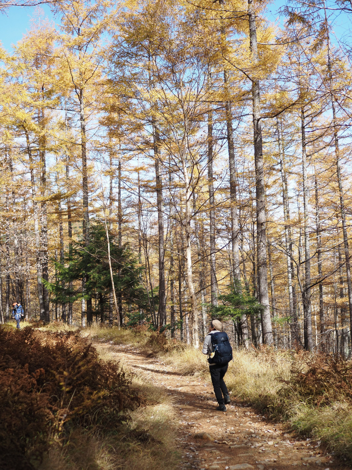 落葉松の黄葉を見上げながらのハイクは、最高に気持ちがいい。暑くもなく寒くもない、快適に歩ける季節です。