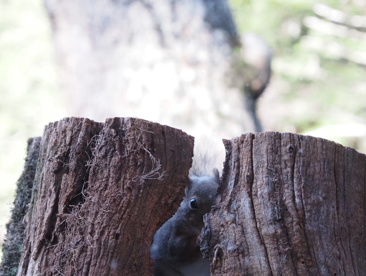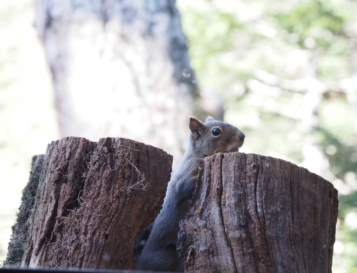 今度はリスが登場、切り株でかくれんぼ。動きが速くて撮るのが大変。