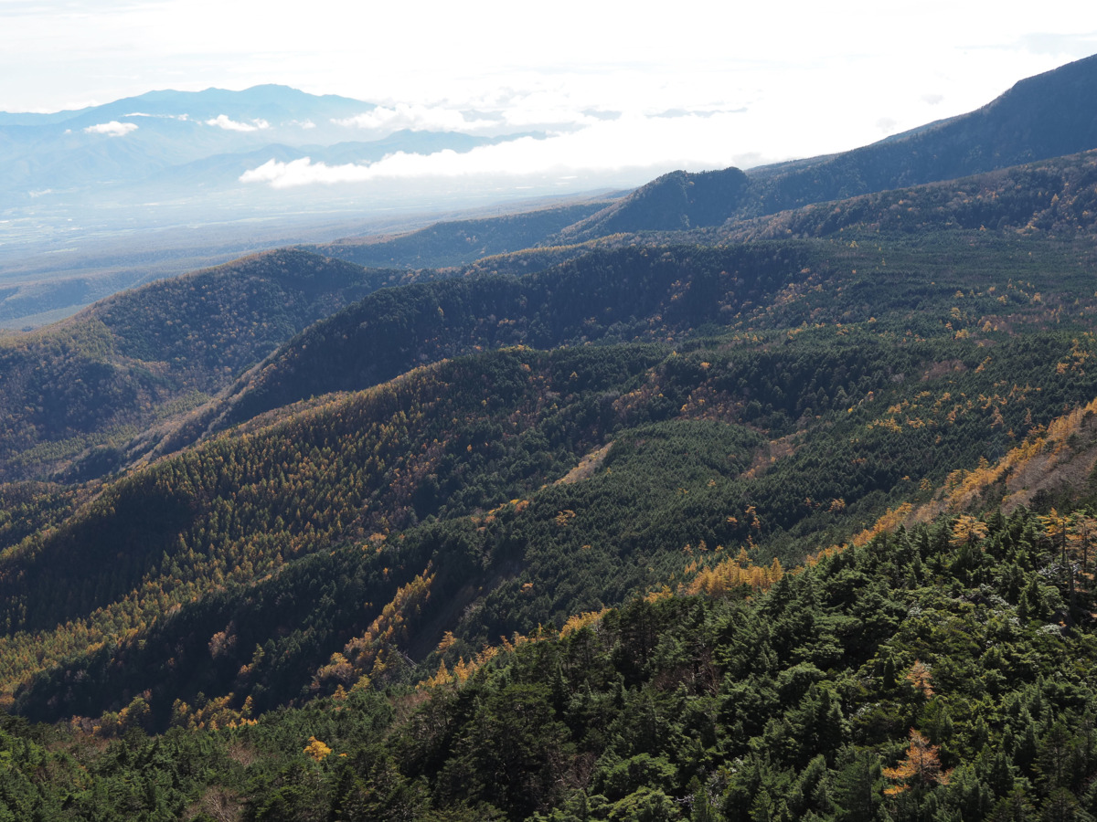 小屋でひたすらゆっくりするもよし、ニュウや天狗岳に登りに行くのもおすすめです。ニュウからの眺め落葉松の黄葉が美しい!しらびそ小屋はどの辺りかな?