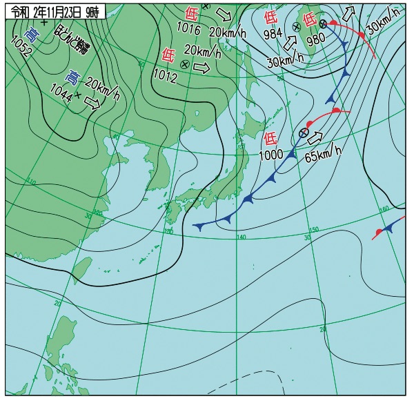 秋になると、低気圧が通過したあとに西高東低の冬型の気圧配置になる日が出てくる。冬型の気圧配置になると、大陸から冷たい風が吹き込み、日本海側では雨や雪、太平洋側は乾燥した晴天となる。