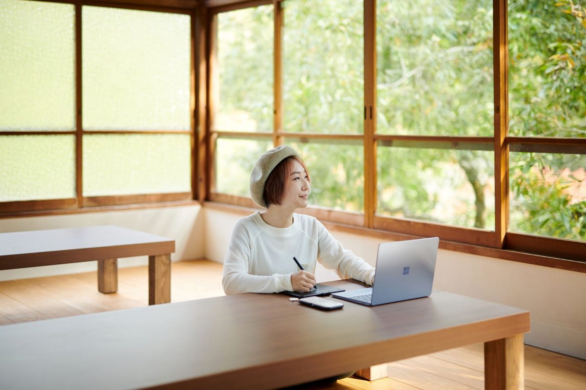 私は今回、東京都の奥多摩で人気の山・御岳山のふもとにあるコワーキング施設「A-flow」におじゃましました。JR御嶽駅からは徒歩5分、目の前には美しい多摩川が見渡せ、バックパックを背負いトレッキングをする人や、大きなマットを背負ったボルダリングスポットに向かう人、清流でカヌーを楽しむ人などがいる場所です。老舗旅館の別館を改装しているとのことで、施設内のところどころにその面影があり、居心地のよさを感じます。