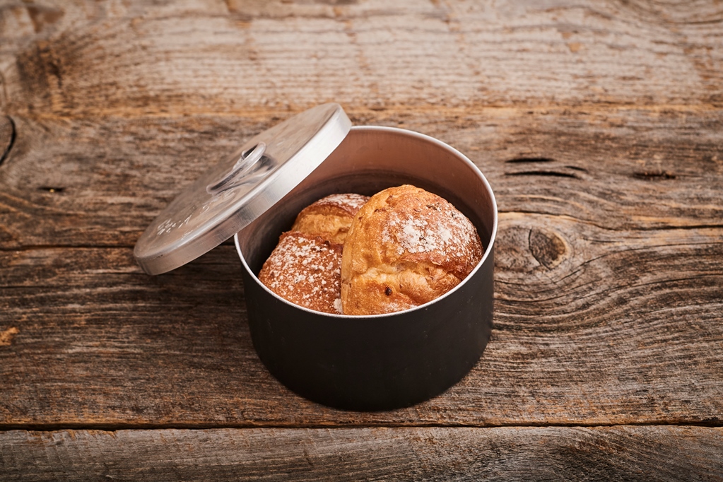 丸パンは直径約15cmのものを使用。ごはん時までパンが潰れてしまわないようにクッカーに入れて持ち運びましょう。