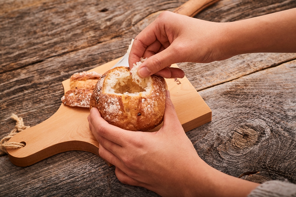 2.丸パンの上部を薄く切り取り、パンをくりぬく。上部だけをナイフで切り取り、手で中のパンをつまんで取り出す。