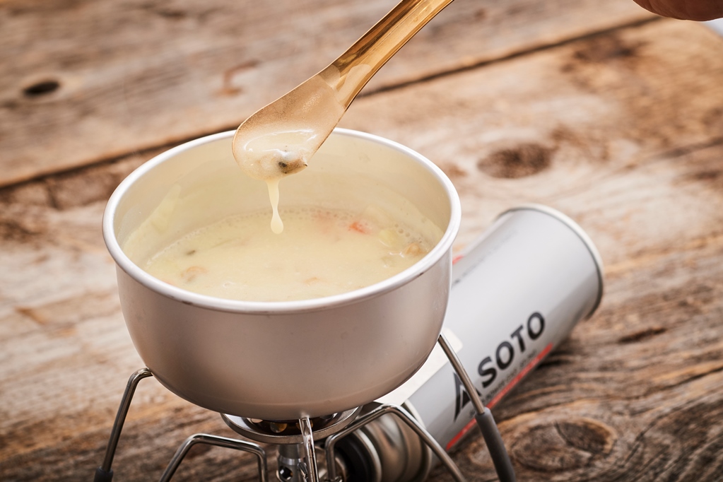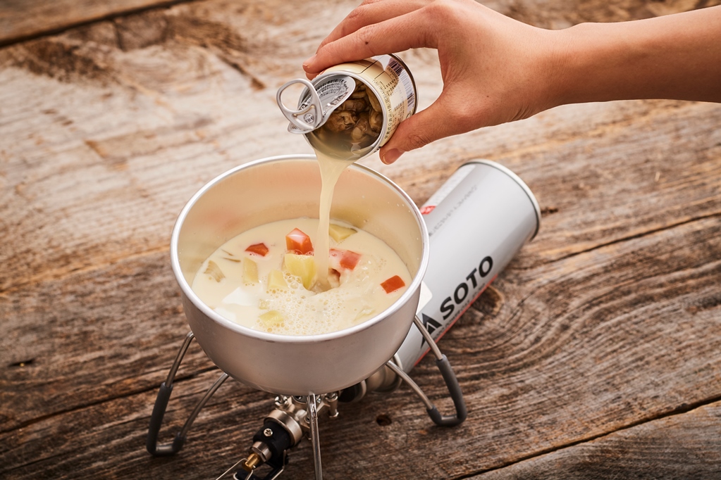 冬の低山でのんびり山ごはんを楽しみたいときにぴったりな、ほかほかのクラムチャウダーとスープパスタのレシピを紹介。主役はアサリ缶。この缶詰は、身というよりも、汁が旨味の宝庫! 疲労回復にも効果的&ボリュームたっぷりのレシピです。