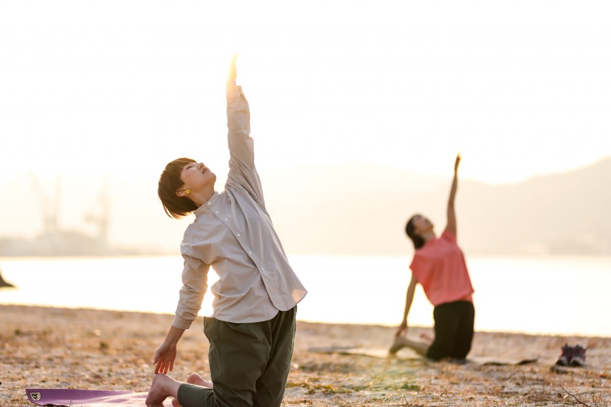 ビーチやキャンプ場など島内のすてきなロケーションでヨガができる。岩城産のレモンのアロマをリボンにつけて、腕に巻いてヨガをする。リボンについたアロマが風に吹かれて、レモンがふわっと香り、心と体を癒やしてくれる。終わったあとはホットレモンで体を整える