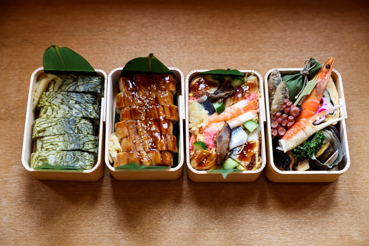 居酒屋ととやが販売する2段弁当「ゆげ海の駅弁」。ベースのおかず(写真右)に右から海鮮ちらし寿司、煮あなご寿司、おぼろ鯖寿司のいずれかを選ぶ。おぼろ鯖寿司が一番人気だそう