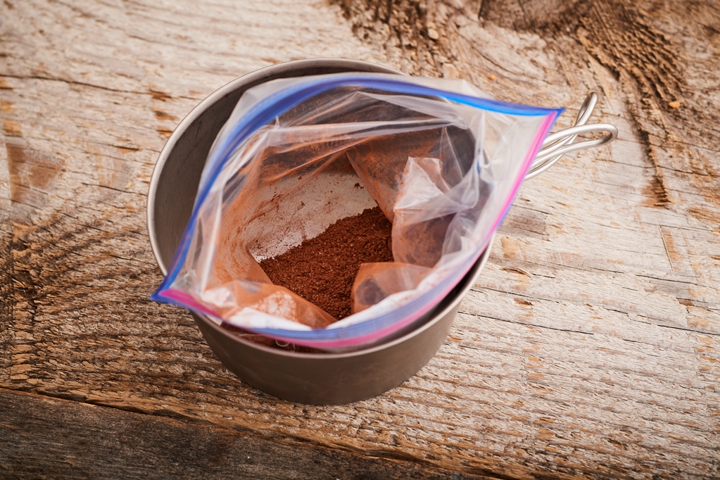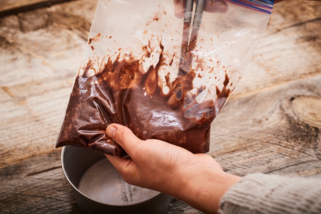 1.保存袋にココアパウダーときび砂糖を入れる(ここまでを家でやっておくとよい)。