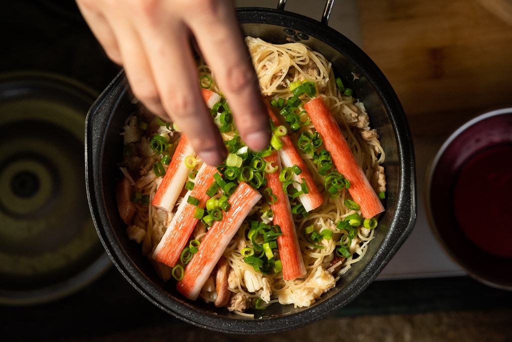 ほろ酔いで勢いに乗った僕は、ここで一気に予定していた海鮮焼ビーフンを作り始める。ケンミンの焼ビーフンは山で使えるというウワサを聞き、家ではあまり食べることのないビーフンに挑戦。ホタテの缶詰を汁ごと入れ、カニカマで海鮮感を出した。