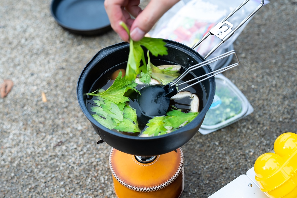 山ではゴミを捨てられないので、なるべく食材を使い切りたい。夜の残り物を使ってスープを作る。固形のコンソメと塩コショウで適当に味付けしたものだが、朝のスープは体に染みわたる。きっと山ではこの3倍はありがたく感じることだろう。