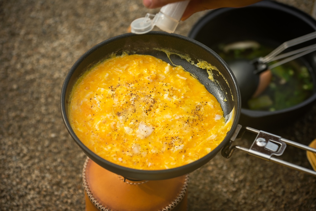 クッカーはスノーピークのヤエンクッカー1000。クッカーはいくつか持っているが、フライパンのサイズと、浅型の鍋が気に入っていて、ひとつ持っていくなら、いまはこれの気分。そこに、プリムスのワンバーナーとオピネルのナイフ、今回のために購入したモンベルのウォーターパックを加えれば、とりあえず食事はなんとかなるだろう。