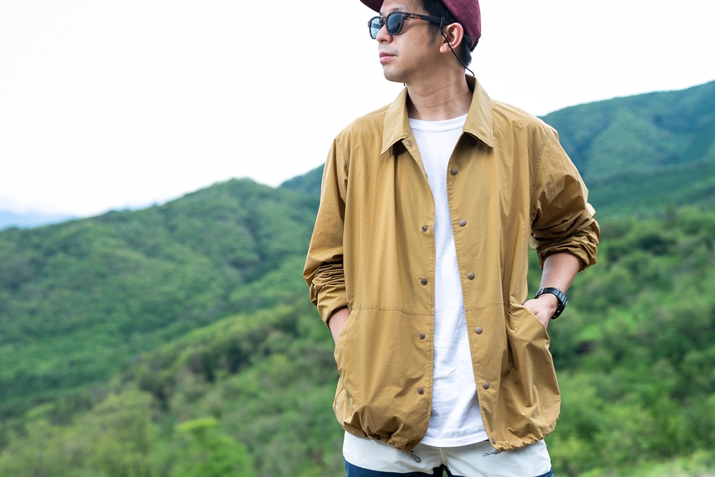 カタログのモデルもやらせてもらった、マーモットのジャケット。薄くて軽いのが特徴で、軽い登山やキャンプなど、さまざまなアウトドアシーンで活躍してくれる。撥水加工をしてあるため、短時間の小雨であれば、レインウエアを出さなくても大丈夫。大げさじゃないので、フェスでも活躍しそう。