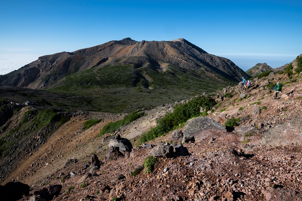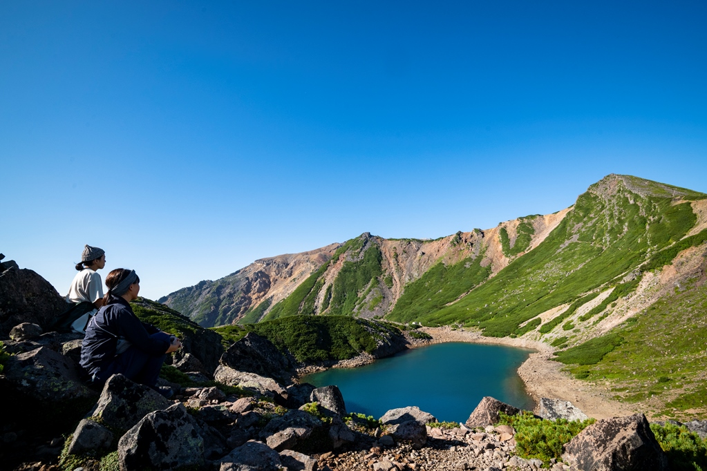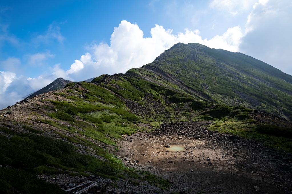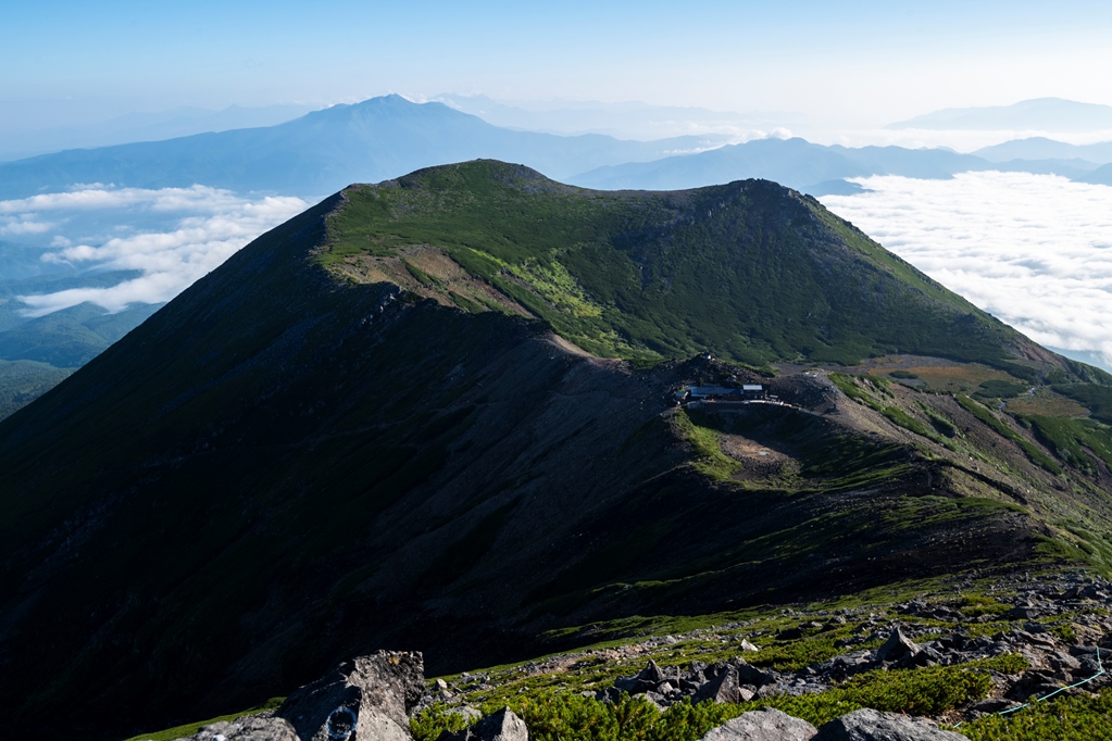 ▲五の池小屋の目の前は、五の池と摩利支天山。山小屋で過ごすあいだ、雲の形も山肌の色も少しずつ変化するので、見飽きることはありません。