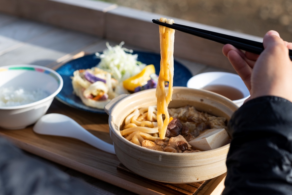 ▲自家製味噌で煮込んだお鍋は、体に染み入るおいしさ!テラスのカウンターテーブルで、摩利支天山を眺めながらいただきました。