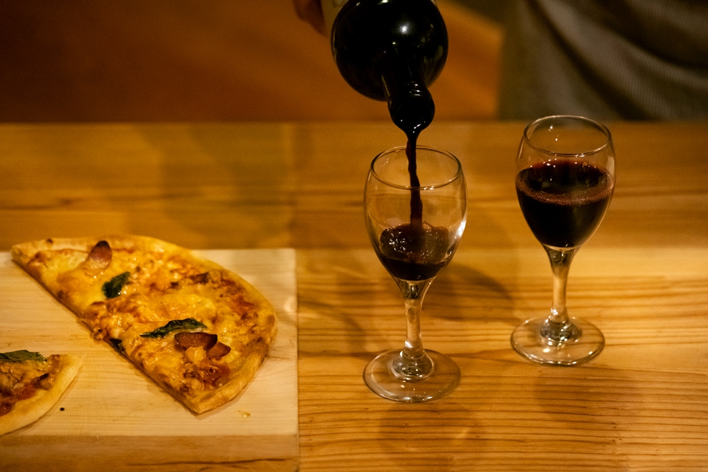 ▲名物の焼きたてピザは、ふもとの酒屋さんセレクトのワインと一緒に。クリスピー生地にトッピングされた燻製チーズやソーセージが美味!