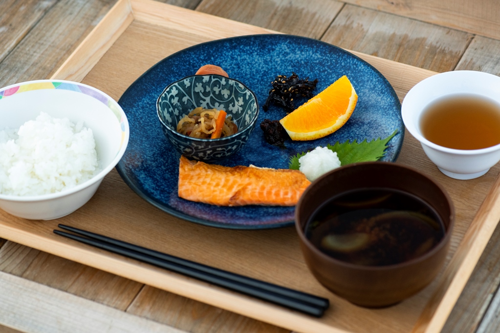 ▲朝日を眺めたあとにいただく朝食は、三の池のように美しいブルーのお皿で。