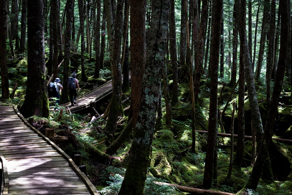 ▲歩き始めてすぐの苔の森。森林限界よりも上、荒涼な印象の強い御嶽山だけに、その美しい森の姿に驚き一気に魅せられます。
