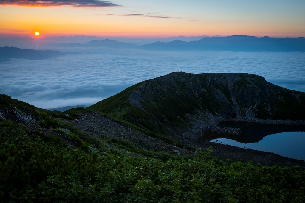▲五の池小屋の目の前は、五の池と摩利支天山。山小屋で過ごすあいだ、雲の形も山肌の色も少しずつ変化するので、見飽きることはありません。