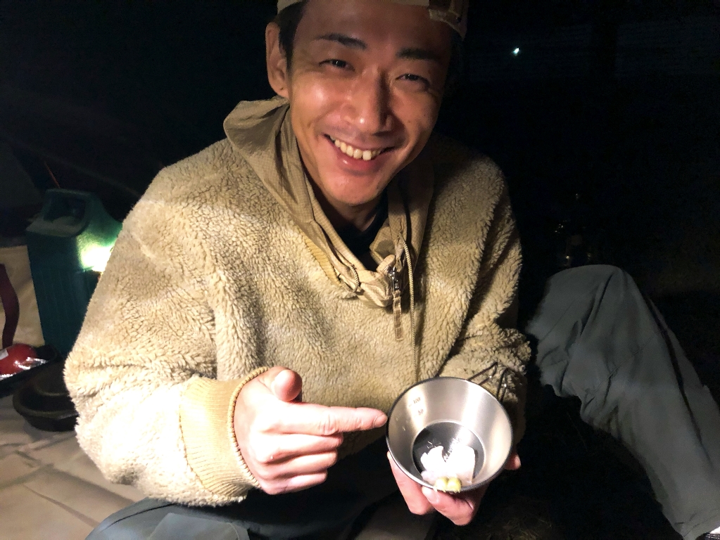 夜になり、それぞれの夕食タイム。どんどん楽するほうに向かっている僕は、ホンビノス貝を焼き、ホルモンを焼き、しいたけや厚揚げを焼くだけの酒のツマミセット。そこに、おとなりさんの拓ちゃんが、釣った魚を捌いて刺身と素揚げにして持ってきてくれた。「作りすぎちゃった」という幻聴が聞こえた。これでもう完璧な晩酌セットが完成。