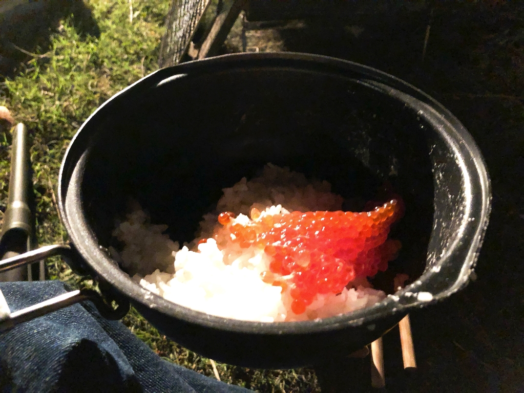 クッカーで米を炊き、買ってきた筋子を乗せただけのシメ。これを刺身のお返しに拓ちゃんの皿へ。このへんから行き来が頻繁になり、最後は焼酎のお湯割りを飲みながら、ひとつの焚き火を囲む時間に。
