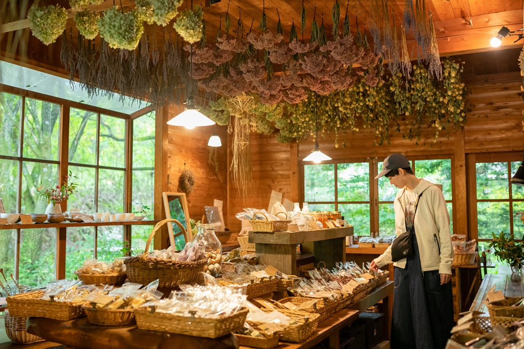 自然のなかに溶け込むような佇まいのお店は、季節ごとのハーブティーやエッセンシャルオイルなどがずらりと並び、香りに満ちた空間。木の実や落ち葉が地面を彩り、小川の流れる庭もあり、ゆっくりと深呼吸したくなる。花々と柑橘、ペパーミントやローズマリーなどの香りがふわりと漂うオリジナル・ルームフレッシュナーや、「香りのアロマペンダント」など、アウトドア好きの女子が、旅先や自宅で使いたくなるアイテムも多数。
