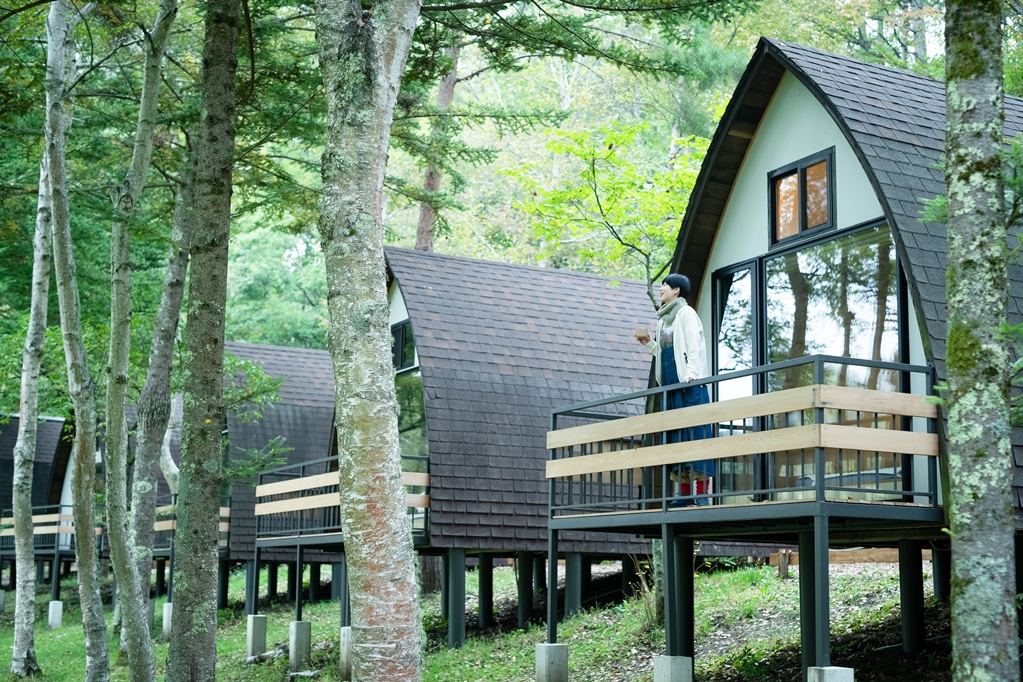 旅の拠点となる宿泊場所は、蓼科湖畔に建つ宿泊施設「タイニーガーデン蓼科」。標高は約1,250m。北八ヶ岳ロープウェイまでバスや車で約15分の立地で、翌日の八ヶ岳登山に備え、ゆっくりと体を休めることができる場所。