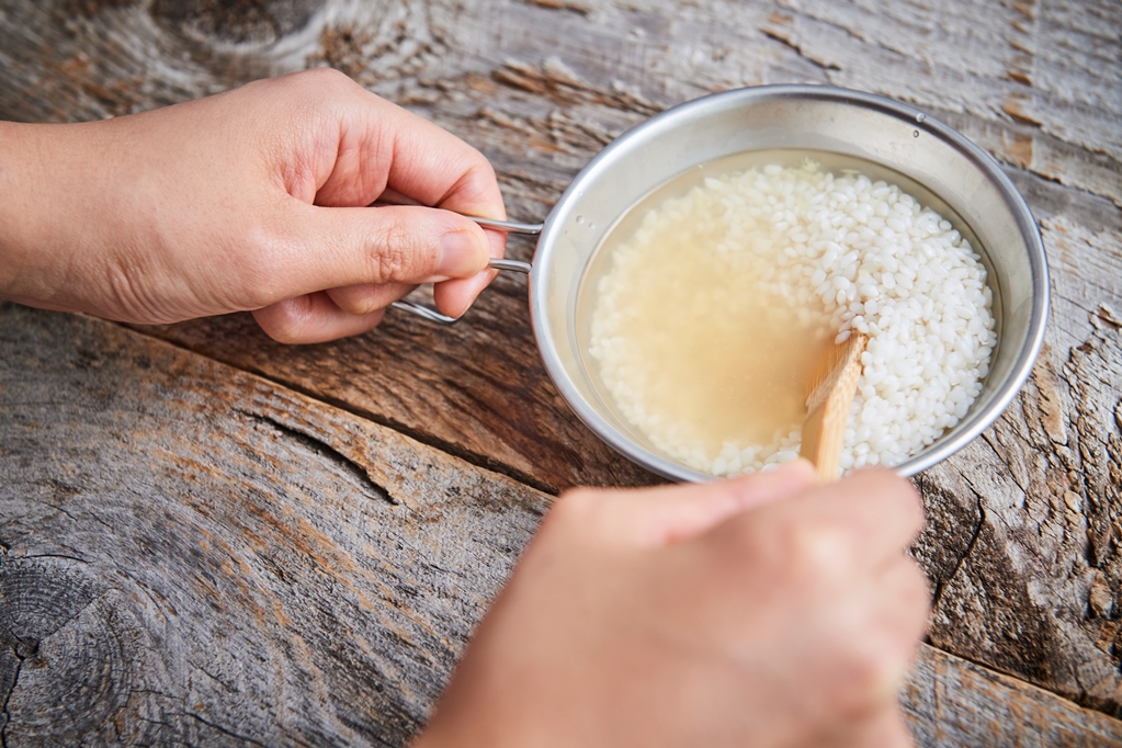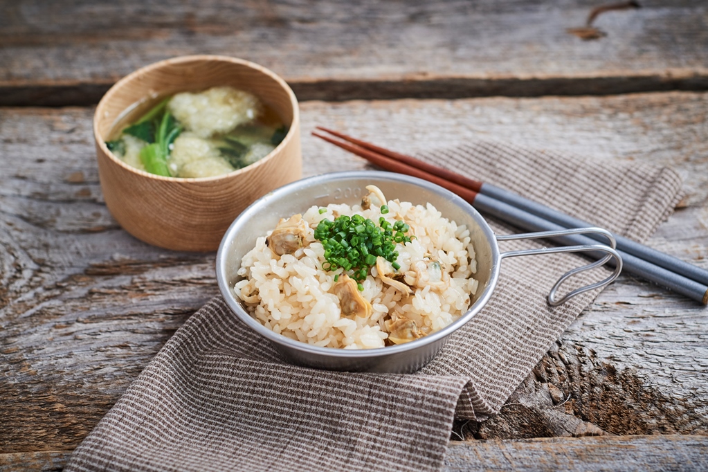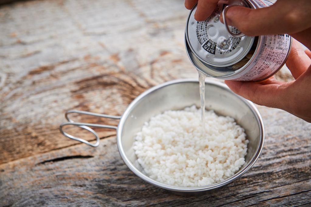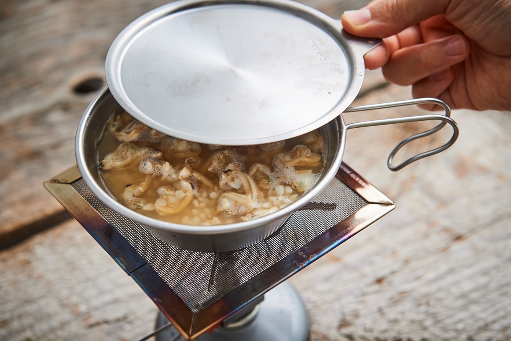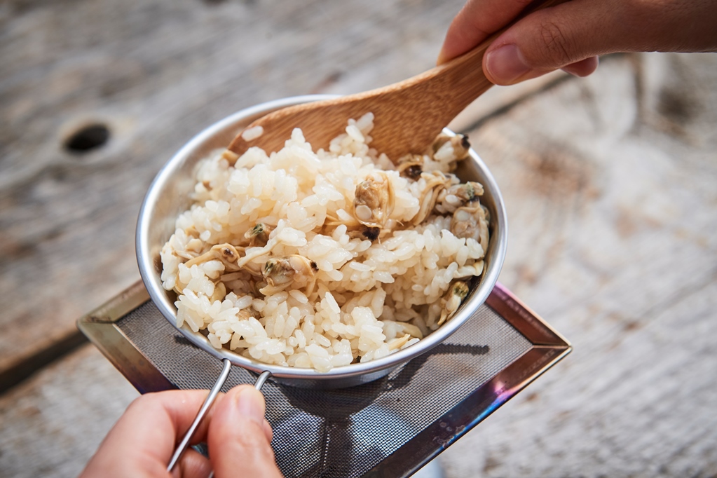 シェラカップとフタ、バーナーパットがあれば、ひとり分(1/2合)から簡単にご飯を炊ける。とろ火でじっくりと加熱できるので、ふっくらとおいしい炊き込みご飯の完成!
