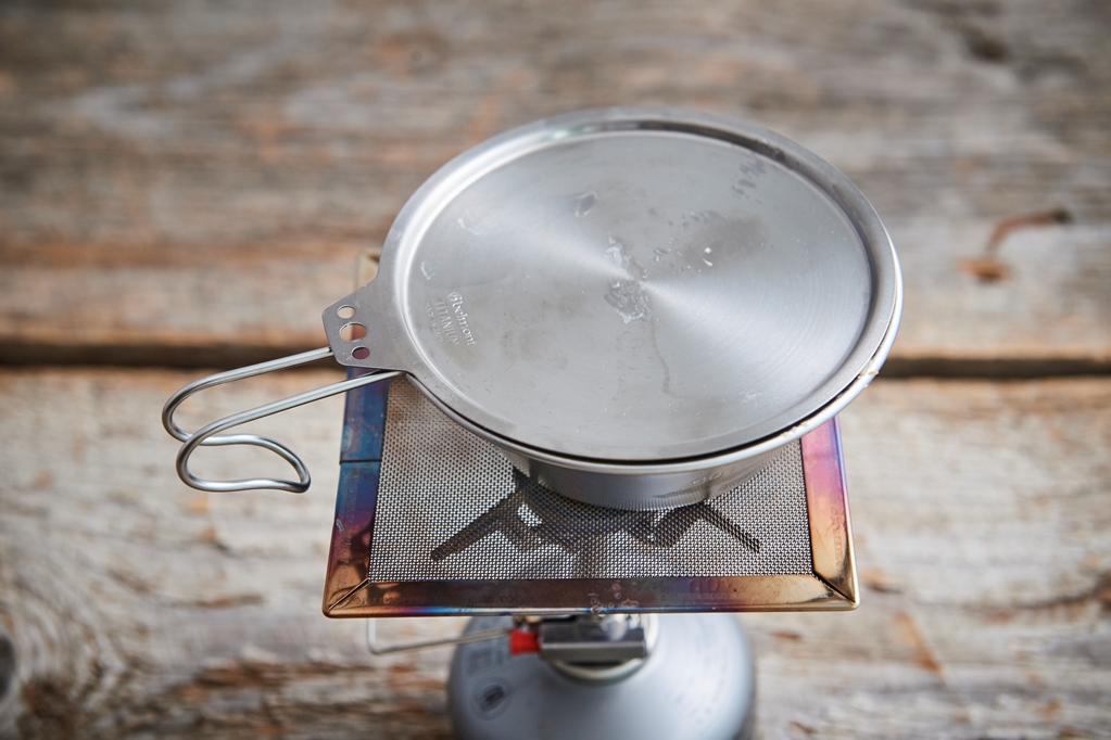 バーナーパットは炎を熱に変える優れもの。とろ火を可能にしてくれるので、料理が焦げつきにくくなります。薄くて軽量、かさばらないので、調理アイテムの中に忍ばせておくと役に立ちます。分離型のバーナーでない場合、輻射熱でガス缶や器具にダメージを与えてしまう場合があるので、短時間の使用にしてくださいね(カノウ)。