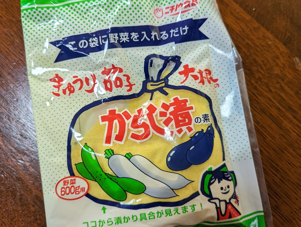 からし漬けの素の袋の裏に作り方の説明があり、「ダイコンは少し干してから漬けると食感がパリパリに~」と書いてあったので、干からびているってことは、干されたってことだ!と、そのダイコンを漬けてみました。